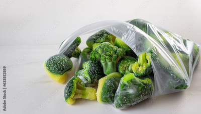 Frozen broccoli spilled out of a plastic bag. Light background with copy space. Selective focus