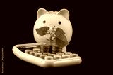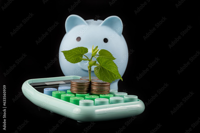 A young sprout with green leaves, piggy bank and 25 US cent coins on a calculator