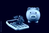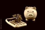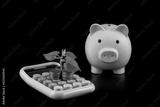 A young sprout with green leaves, piggy bank and 25 US cent coins on a calculator
