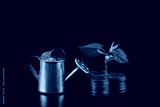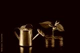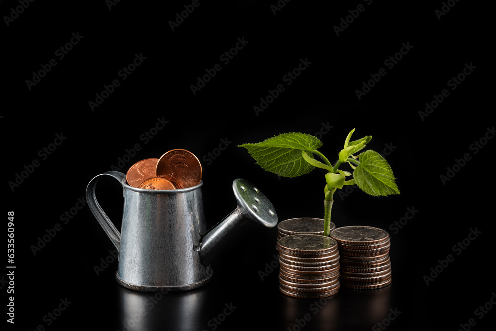 A young sprout with green leaves, US coins and a miniature watering can on a black background