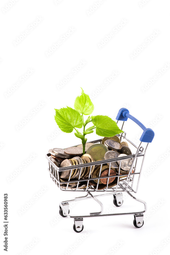 A young sprout with green leaves and a shopping trolley from a supermarket with coins from different countries of the world on a white background