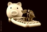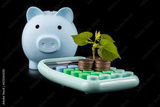 A young sprout with green leaves, piggy bank and 25 US cent coins on a calculator
