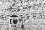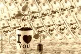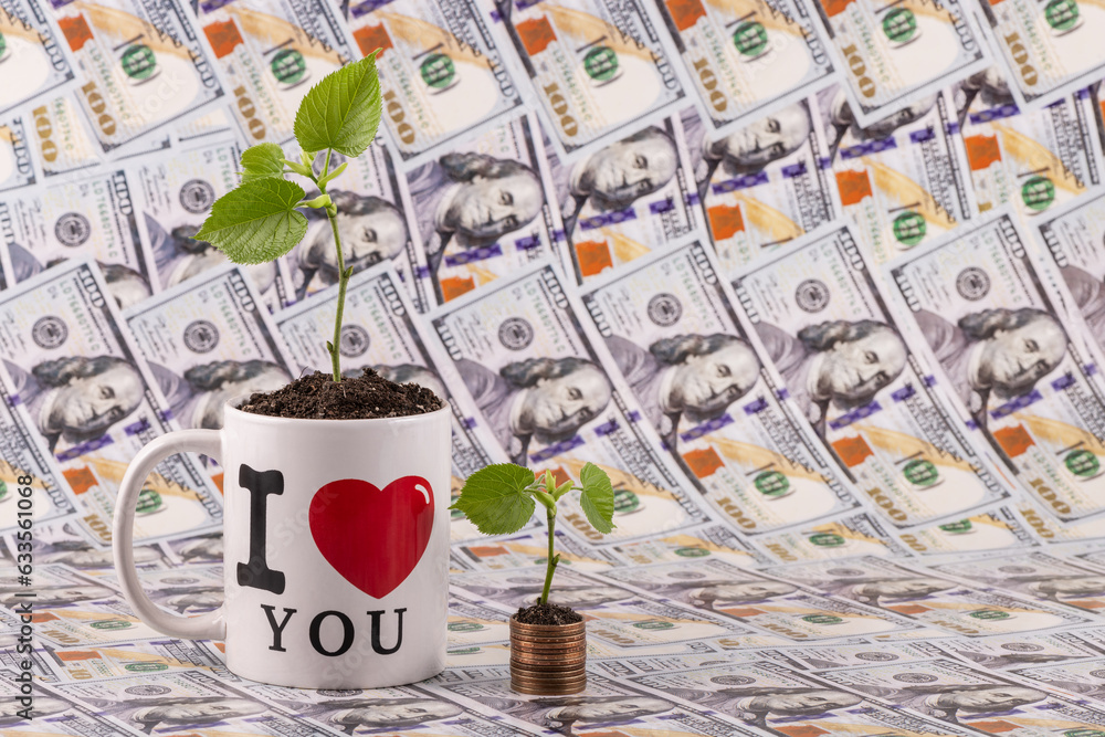A young sprout with leaves in a mug against the background of 100 American dollar bills