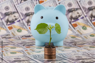 A young sprout with green leaves, coins and a piggy bank against the background of 100 American dollar bills