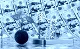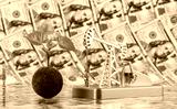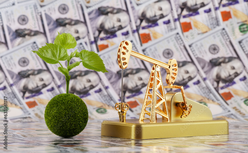 A symbolic green polenet with a young sprout and a miniature gold oil pump against the background of 100 US dollar bills