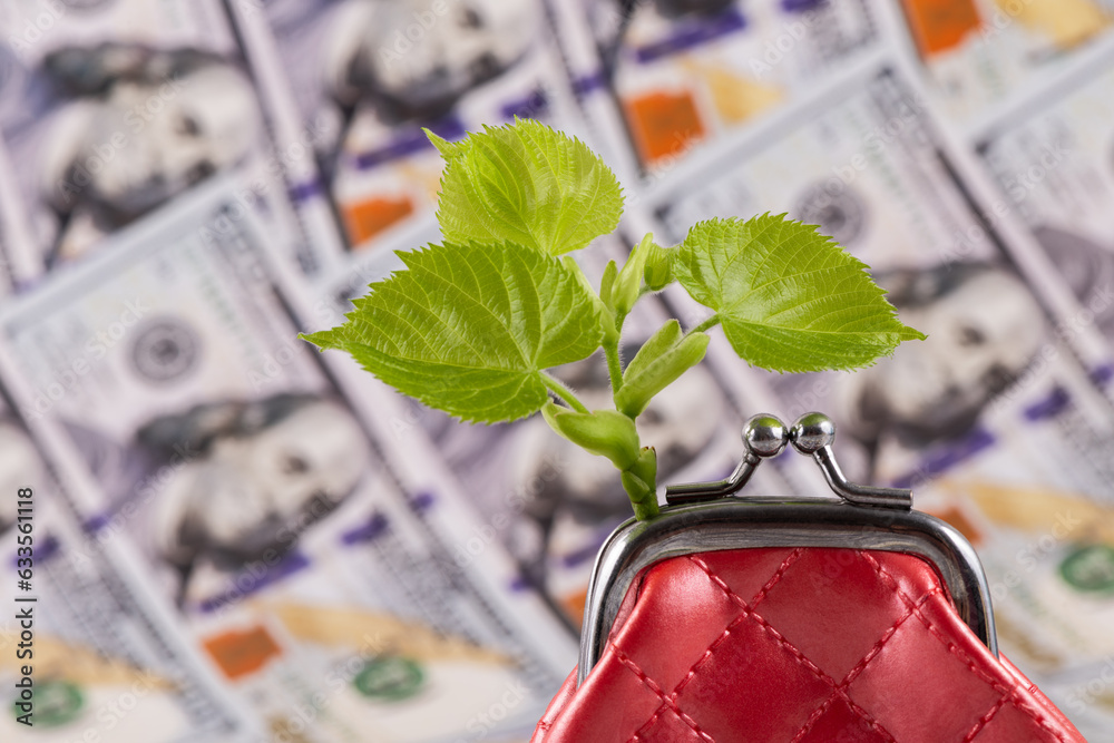 A young sprout with green leaves and a wallet against the background of 100 American dollar bills