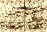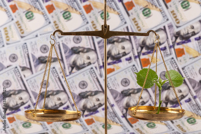 A young sprout with green leaves on the scales against the background of 100 US dollar bills