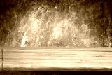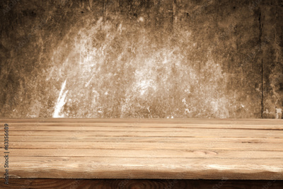 Empty wooden table with copy space for products and dark brown grunge wall background.