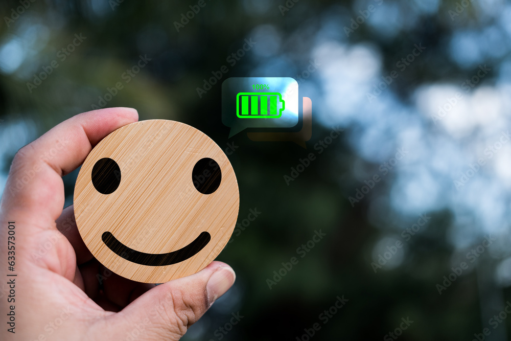 Hand holding wood block with happy smile face and icon of full recharge. Mental health positive thinking and growth mindset, mental health care recovery to happiness emotion.