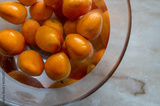 Fresh apricots are cleaned in a bowl of water