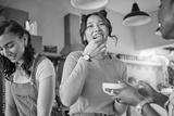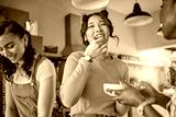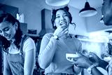 Women, friends and eating healthy food in home for bonding, nutrition and happy lunch together. Fruit diet, sharing and wellness, fresh summer friendship and girls in kitchen with smile at party.