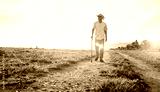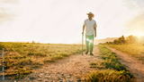 Environment, nature and relax with man on farm for sustainability, agriculture and ecology. Happy, peace and sunset with farmer on countryside field for summer, health and calm with mockup space