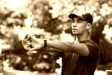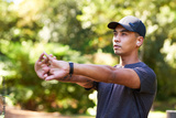 Serious Asian man stretches arms as running warm up, fitness outdoor exercise