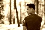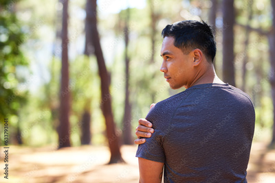Serious Asian man rubs shoulder, sports injury in forest, trail running