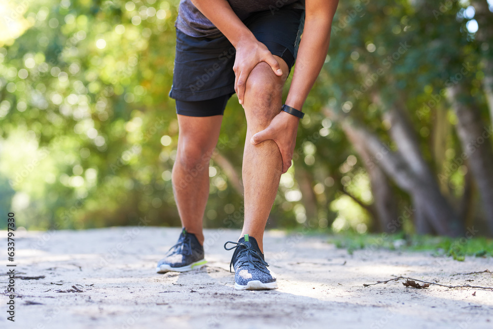 Close up of man holding knee in pain, sports injury inflammation trail run