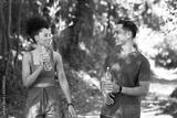 Two tired fitness partners drink water on trail run through forest, exercise