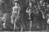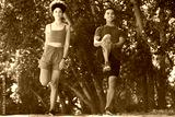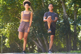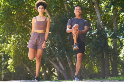 Beautiful couple stretch legs together before running in park, fitness trail run
