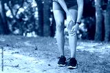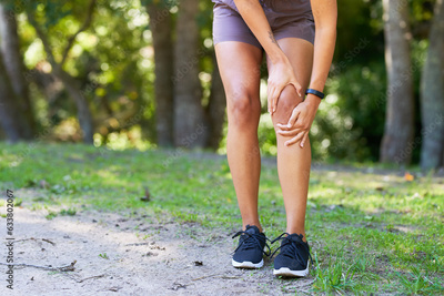 Close up of woman holding knee in pain, sports injury inflammation trail run