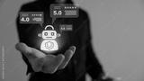 The robotic arm and the star check mark surround the certification, quality control, warranty standards. the concept of digital internet business technology.