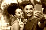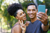 Beautiful young couple takes selfie in park after exercise, fitness running pose