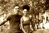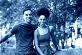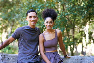 Beautiful couple taking break on hike through forest, sitting on log talking