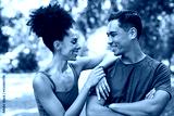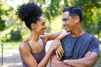 Beautiful young multi-ethnic couple exercise together in park, pose and smile