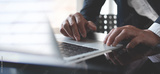 Close up of business man working on laptop computer. Businessman surfing the internet on laptop computer, searching the information, online working with digital tablet on office desk
