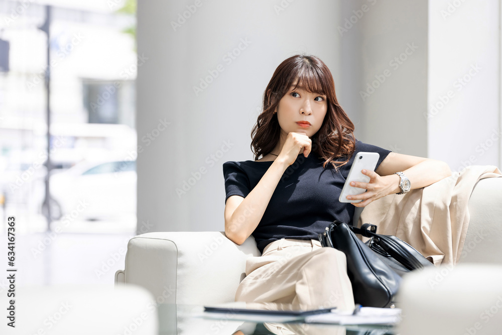ソファに座ってスマホを使う困った表情のビジネスウーマン