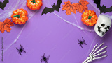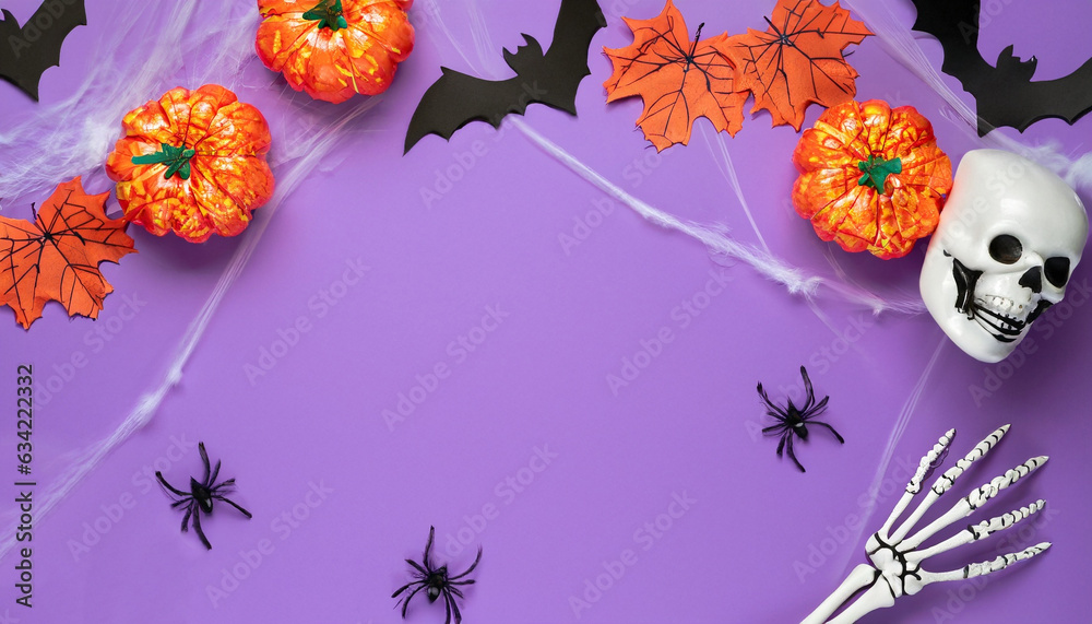 Halloween scary decorations on purple background. Halloween banner template with skull, spiders webs, bats, skeleton hands, ghosts, maple leaves. Flat lay, top view.