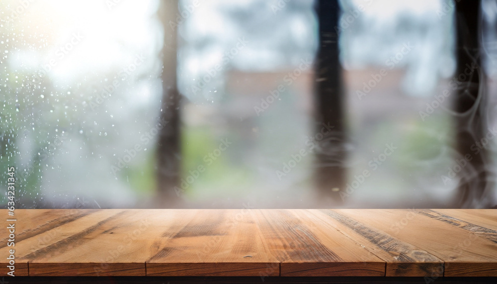 The wooden tabletop on a blur window background with smoke float up with rain , can be used for display or montage your products, Morning light, blurred image