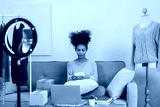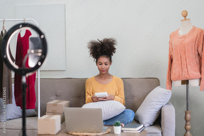 African american fashion merchant woman use calculator and selling online clothes in live streaming