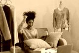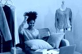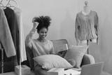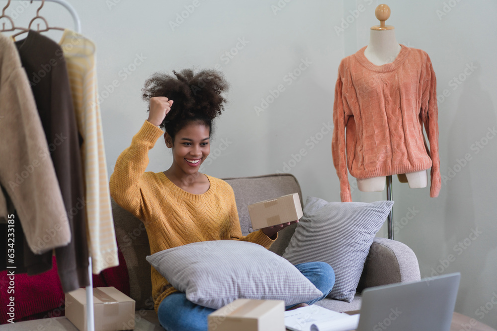 African american fashion merchant woman raise arm with happiness while check online order on laptop