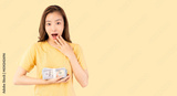Excited young asian woman holding money banknotes and celebrating isolated yellow background Happy asian lady showing money dollars and Smiling satisfied girl earning a lot of money or win lottery