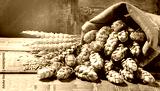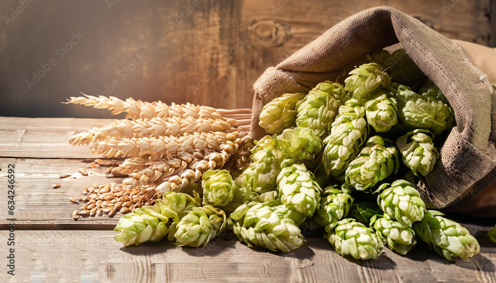 Beer brewing ingredients Hop in bag and wheat ears on wooden cracked old table. Beer brewery concept. Hop cones and wheat closeup. Sack of hops and sheaf of wheat on vintage background.