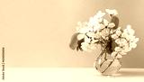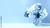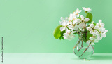 Spring or summer festive blooming with white flowers fruit tree branches in a small glass vase against tender pastel green background. Fresh floral wide background banner with copy space
