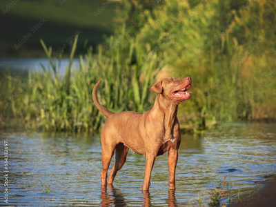 Cute dog swimming in the river on a clear, sunny day. Closeup, outdoors. Day light. Concept of care, education, obedience training and raising pets