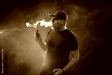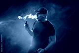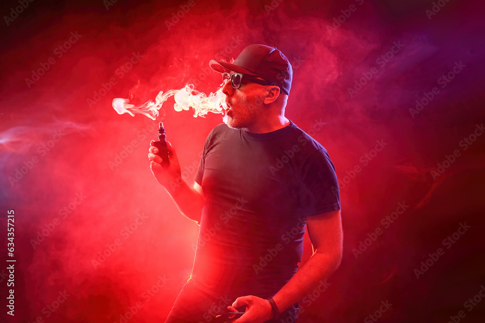 Man smokes vape. Guy with vaping device. Male with electronic cigarette. Man vaper in red smoke. Vaping smoking. Vape e-cig. Vaper blows smoke from mouth. Concept selling vape gadgets