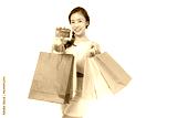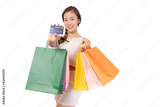 Shopping Asian lady showing credit card holding shopping bags Young asian lady using credit card carry shopping bags isolated over pastel yellow background and copy space Pretty girl enjoy shopping