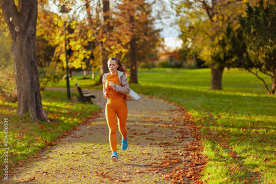 young woman in fitness clothes in park running