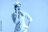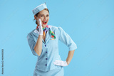 happy modern female flight attendant on blue sharing good news