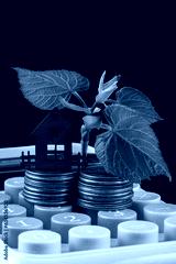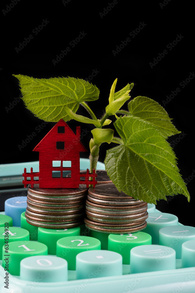 Young sprout with green leaves, american coins and calculator on black background