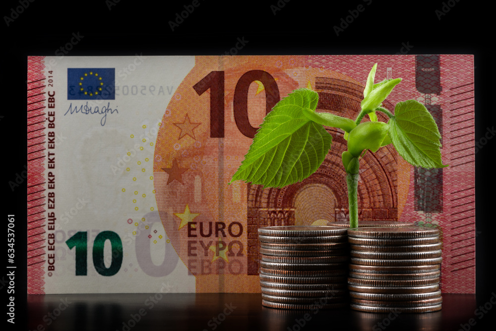 Young sprout, coins and 10 euro banknote