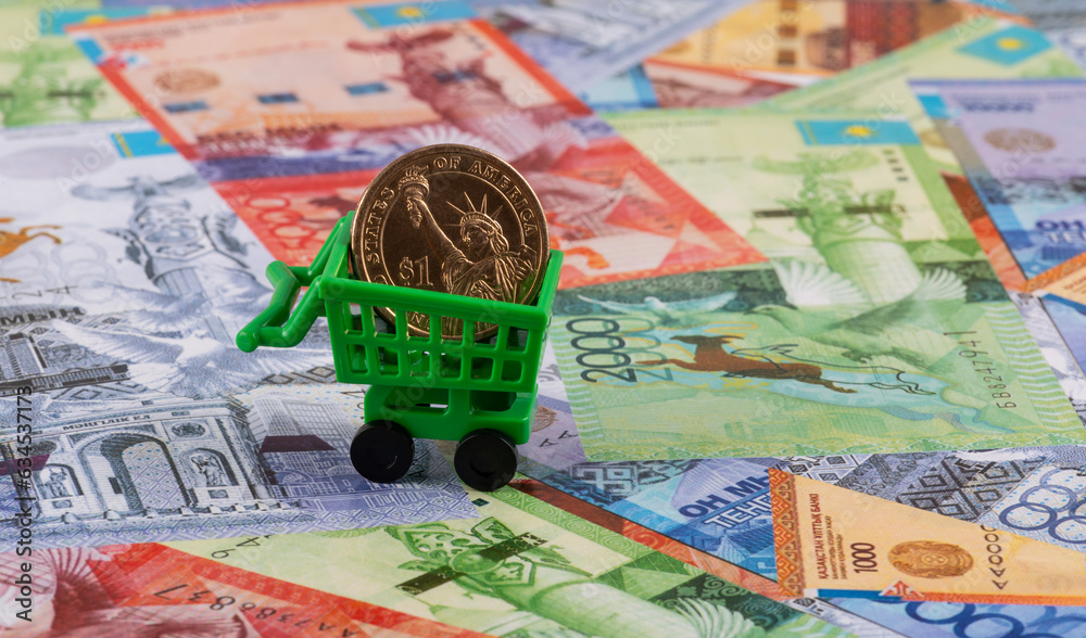 Coin in denomination of 1 American dollar and curry of Kazakhstani currency - tenge