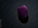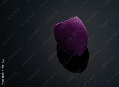 Purple makeup sponge on dark background. Soft makeup cosmetic sponge. Flat-ended make up sponge. Beauty blender for flawless makeup. Makeup tool. Beauty product. Beauty must-have item.
