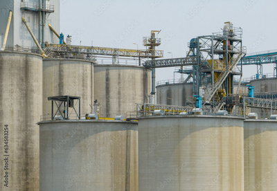 Animal feed factory. Agricultural silos, grain storage silos. Agriculture industry. Rural agribusiness. Grain storage innovation. Agricultural silos at animal feed factory. Sustainable farming.