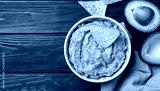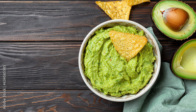 Fresh guacamole dip with chips on dark wooden background. Food and vegetarian concept. Top view.