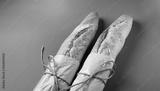Three french baguettes packed in paper and tied with a rope, side view, blue background