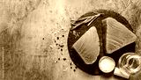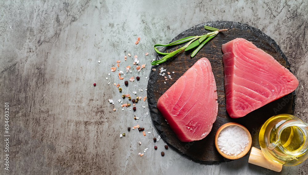 Raw Tuna fish steaks on vintage background flat lay. Healthy cooking. Food concept. Top view