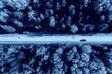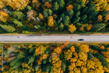 Aerial view of cars on fall country road in colorful autumn forest in Finland