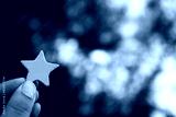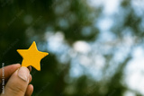 The man holds yellow wood symbolism on a green nature background. Customer service and satisfaction idea received.